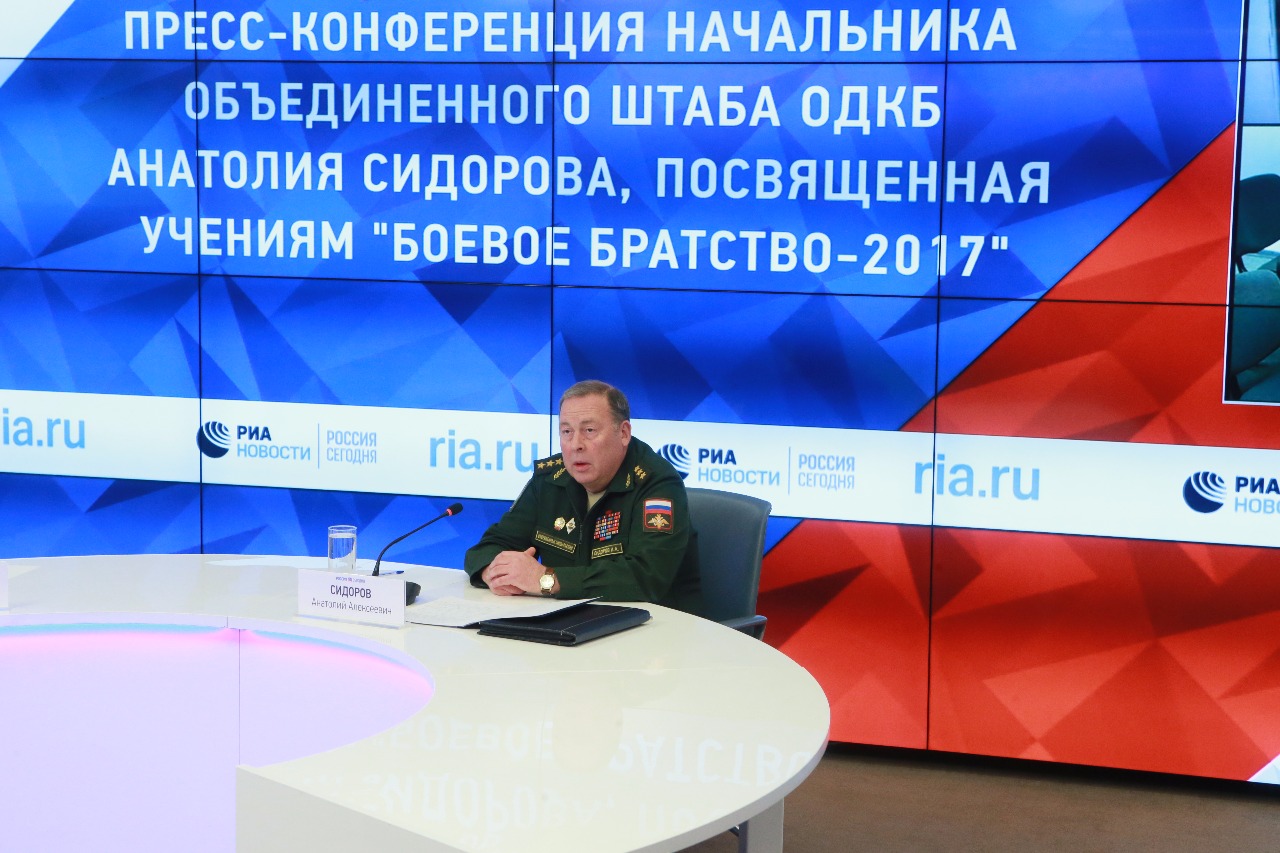 26 сентября 2017 г. в преддверии проведения совместного оперативно-стратегического учения «Боевое братство-2017», начальник Объединенного штаба ОДКБ генерал-полковник Сидоров Анатолий Алексеевич в Центре кризисного реагирования ОДКБ дал эксклюзивное интервью телерадиокомпании «Мир» и провел в Международном мультимедийном пресс-центре МИА «Россия-Cегодня» мультимедийную пресс-конференцию с видеоподключением площадок в Ереване, Минске, Астане и Бишкеке.